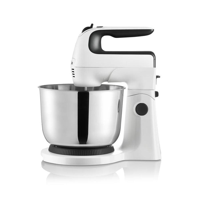 3.5L stainless steel mixing bowl included with stainless steel beaters, whisks and dough hooks.